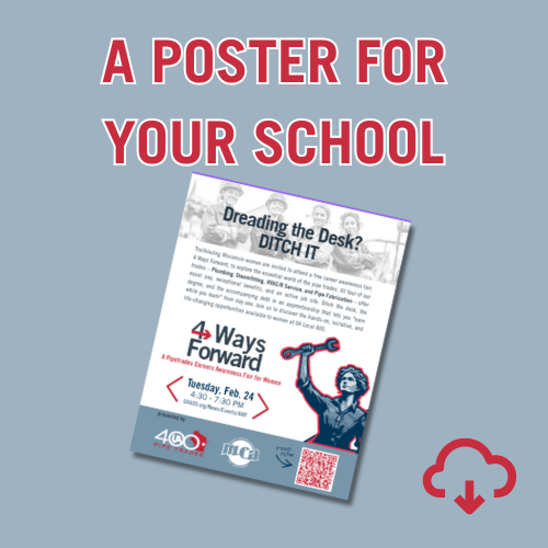 If you’re a woman in Northeastern Wisconsin and this sounds like you, Plumbers & Steamfitters Local 400 invites you to explore the pipetrades at our career awareness fair, 4 Ways Forward, on Tuesday, February 24, 2026. Explore the essential world of pipe trades: four separate disciplines—plumbing, steamfitting, HVAC/R service, and pipe fabrication—that each pledge equal pay, exceptional benefits, and specialized skill training. All without a traditional four-year degree.